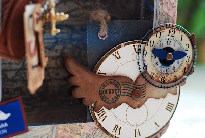 Materials from Scrap-n-Crop.com: Prima Marketing: Whispered Words Flock Alphabet Jenni Bowlin: Who, When, Where Tix and Punctuation Tix Tim Holtz: Ideology Grungeboard, 9'x9' Traveler Cardstock, 9'x9' Time Cardstock, Distress Ink - Old Paper, Vintage Photo, Aged Mahogany Heidi Swapp: Ghost Clocks, Chipboard Ornaments (clocks) Maya Road: recycled chipboard tin, Singleton Clear Stamp - Postcard and Library Card Stamp, chipboard wings, Fresh Chipboard - Antique Keys DaisyD's: Pattern Paper - Timeless Post StazOn: Black Solvent Ink Pad Scrap-n-Crop: brads, photo anchor, eyelets, fibre, clear UTEE and designer's own collection of rubber stamps.